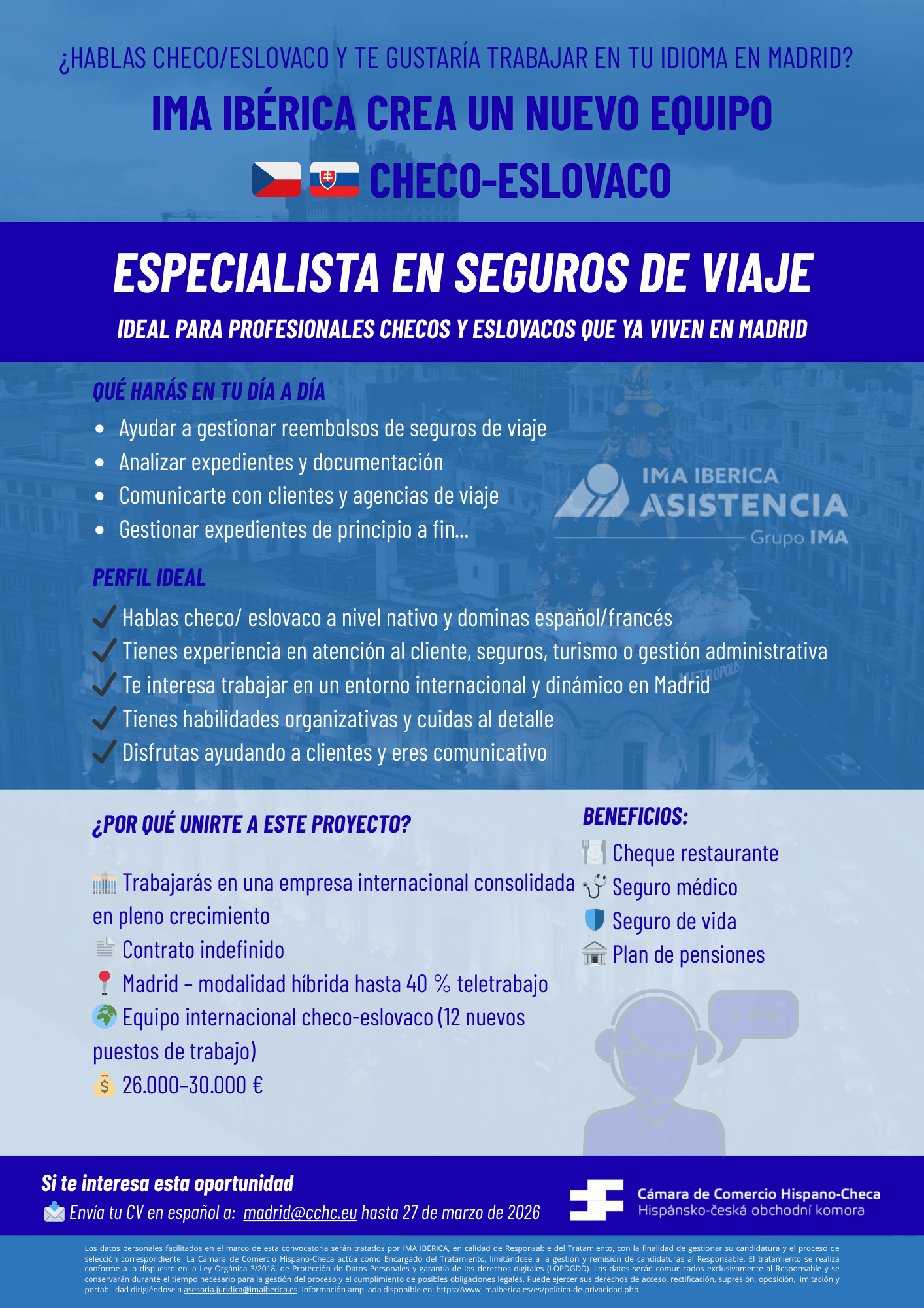 Este proyecto está especialmente pensado para profesionales checos y eslovacos que ya viven en Madrid, pero también los que quieran desplazarse y desean trabajar utilizando su idioma dentro de una empresa internacional consolidada.